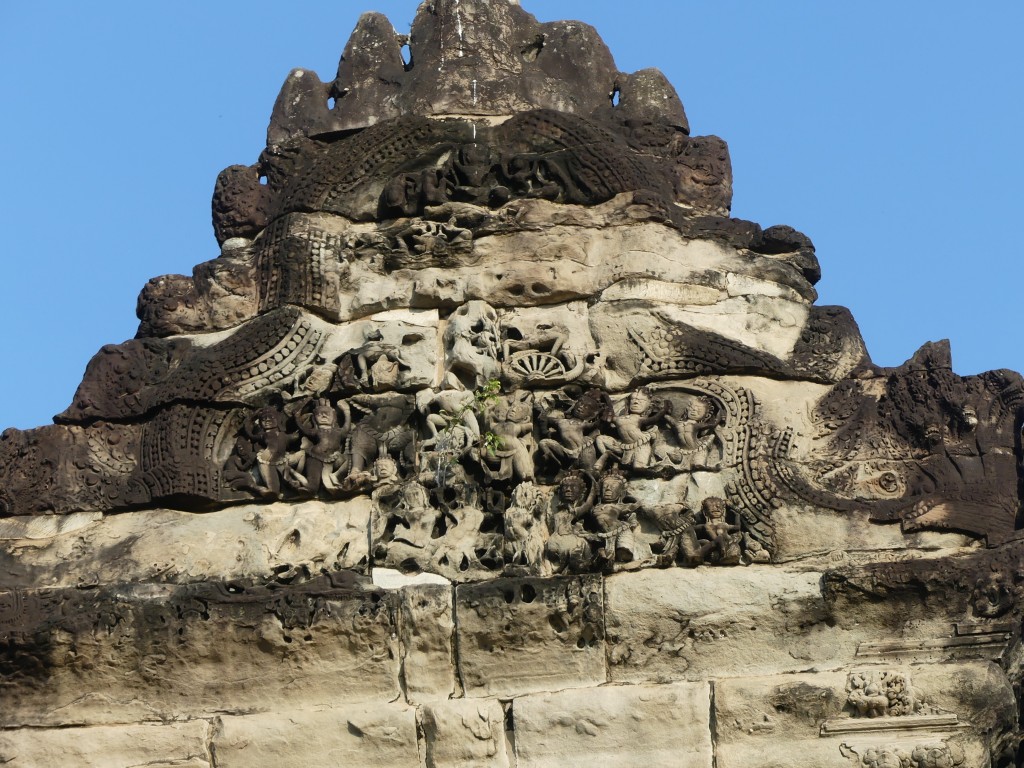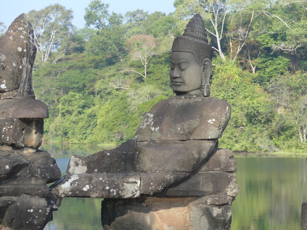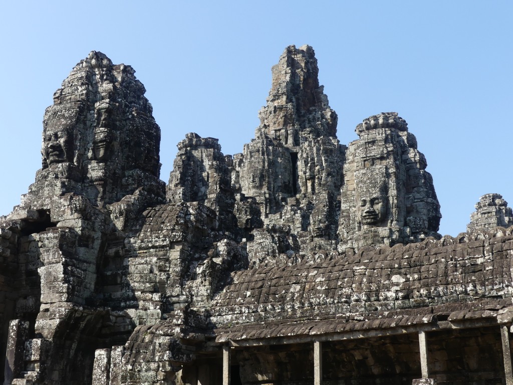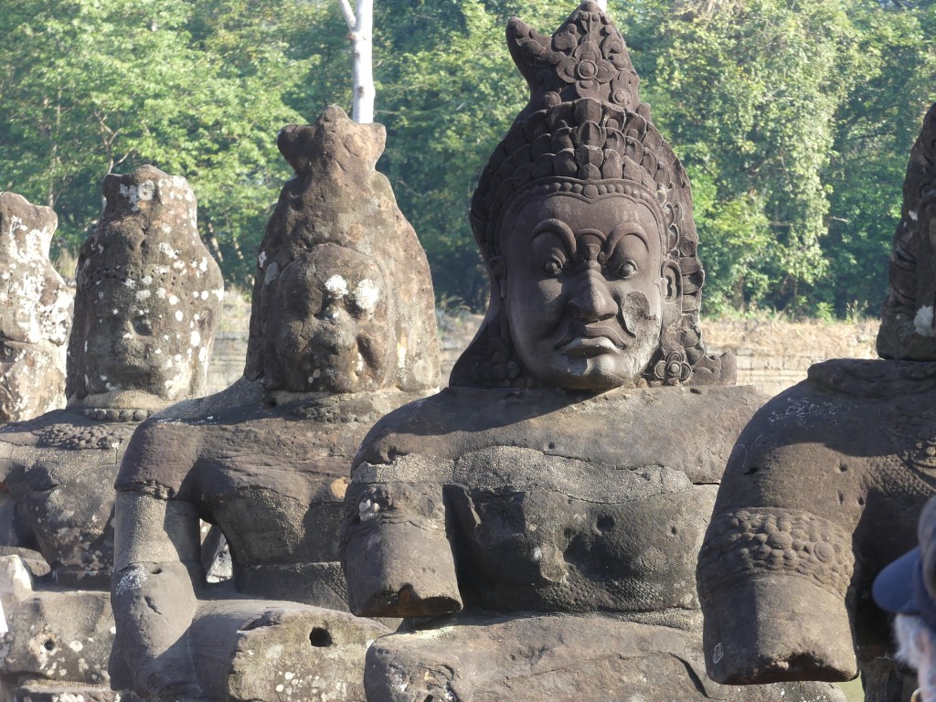 We entered Angkor Thom through the Bayon entrance. This temple is best known for its “smiling faces”, of which there are two hundred set among its fifty-four towers. The temple was built between 1181 to 1218. The gate we entered through has 4 smiling faces. The gate is only large enough for an elephant to fit through, so we had to ditch our large tour bus and transfer to smaller vehicles. A moat surrounds the temple, which helps to preserve the water table. The bridge we crossed has Naga guarding having a tug of war, with good on the right and evil on the left. This temple was built to honor the Hindu god Brahma, whose faces show love, compassion, sympathy, and equality; it is not common in Hindu to have temples built to him. One must be careful in the area – monkeys like to drop rocks on the heads of visitors!