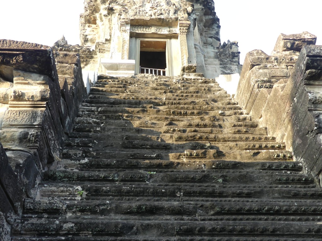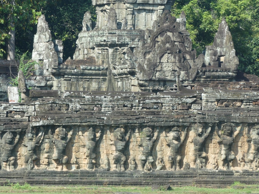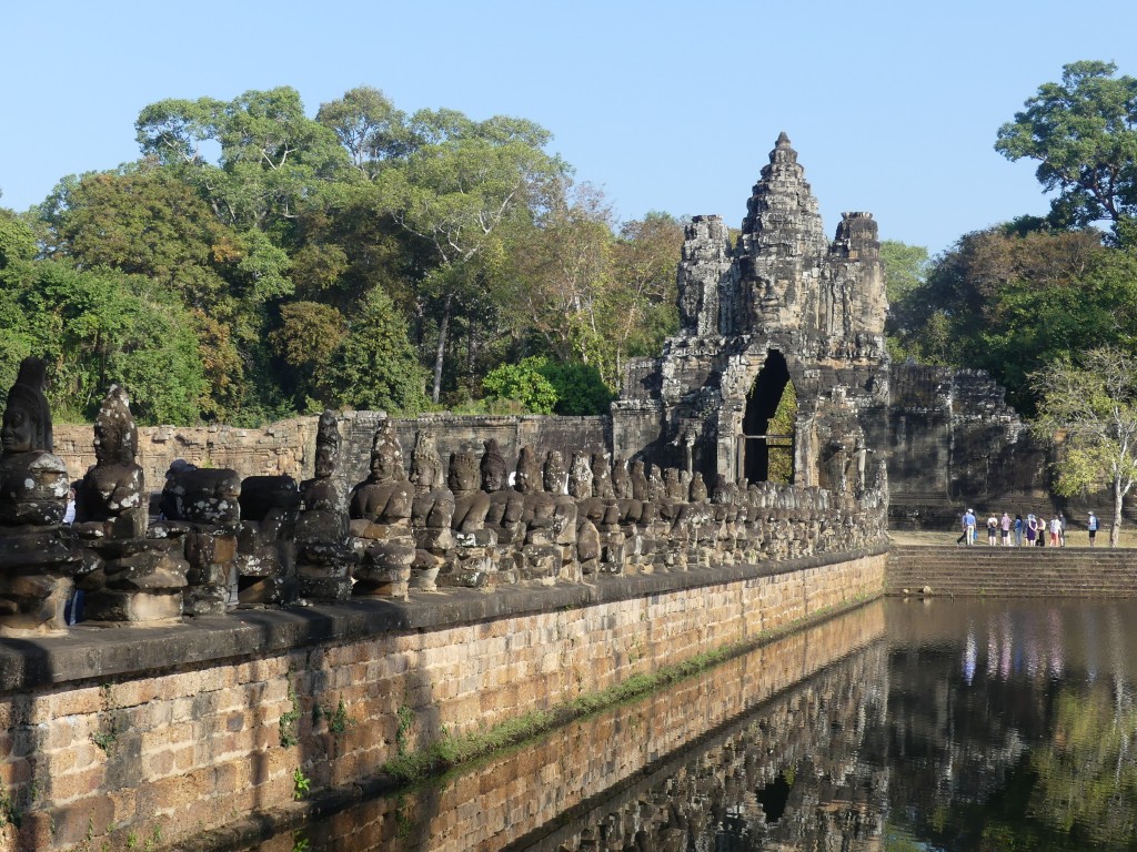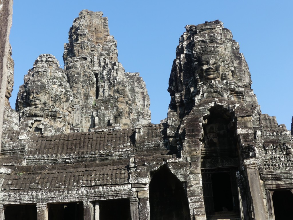 We entered Angkor Thom through the Bayon entrance. This temple is best known for its “smiling faces”, of which there are two hundred set among its fifty-four towers. The temple was built between 1181 to 1218. The gate we entered through has 4 smiling faces. The gate is only large enough for an elephant to fit through, so we had to ditch our large tour bus and transfer to smaller vehicles. A moat surrounds the temple, which helps to preserve the water table. The bridge we crossed has Naga guarding having a tug of war, with good on the right and evil on the left. This temple was built to honor the Hindu god Brahma, whose faces show love, compassion, sympathy, and equality; it is not common in Hindu to have temples built to him. One must be careful in the area – monkeys like to drop rocks on the heads of visitors!