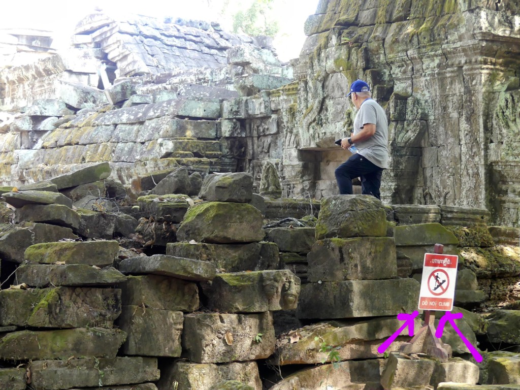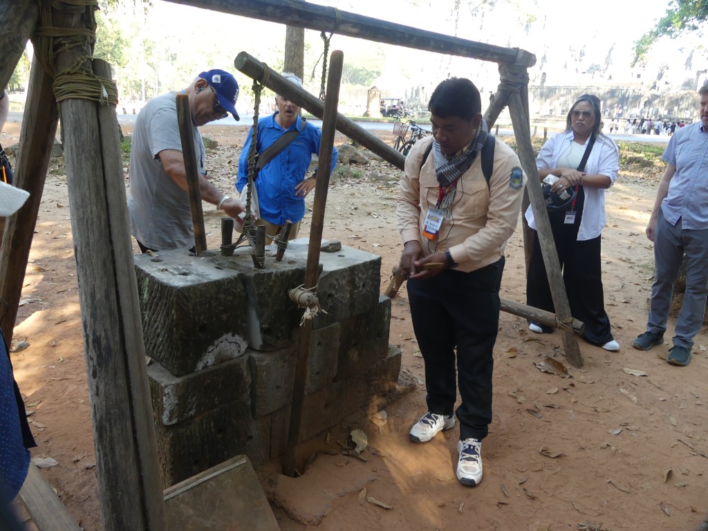 The next visit was to Ta Phrom, built in 1186 by the same king to honor his mother. This is commonly known as the Tomb Raider Temple. Restoration work is ongoing at all of the temples. Coconut husks were used initially, but this was found to be ineffective. Next, they tried bleach, but that damaged the stones. Now, they are using a chemical compound that is much more effective and does not do damage.