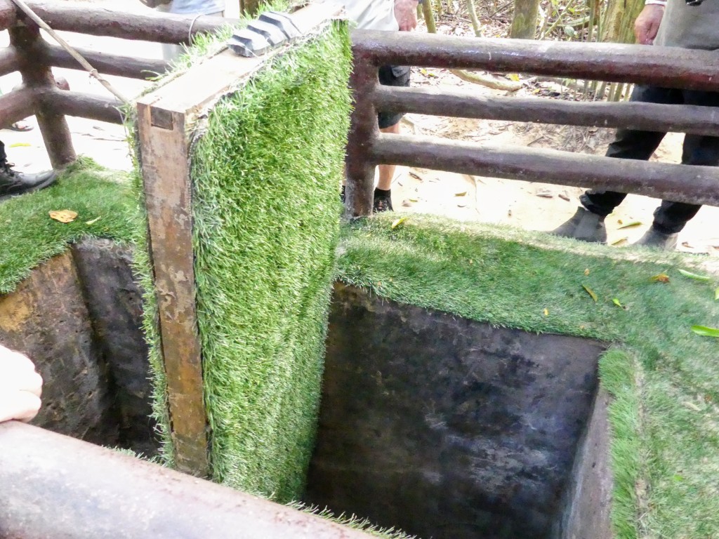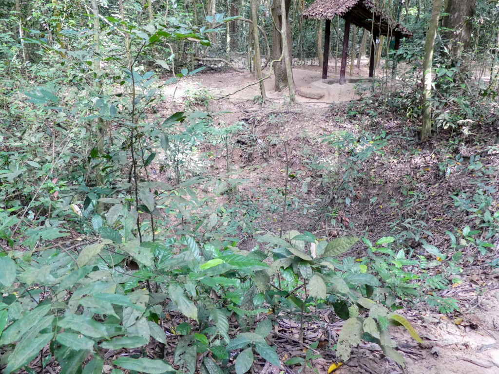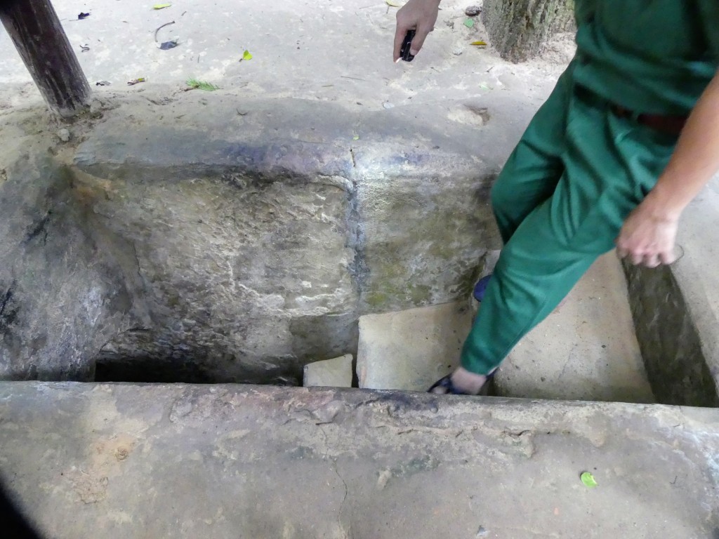 Our first (and for me only) entry into the tunnels involved going down a steep set of steps, going through a tunnel, and coming up the other side. The actual tunnels were only 20″ across. The tunnel we entered had been widened to 30″ so non-Vietnamese sized people could fit. What they didn’t tell us was the height of the tunnel. You had to go through hunched over; it was way too short to stand up in. Clayton’s shoulders got stuck when he went through.