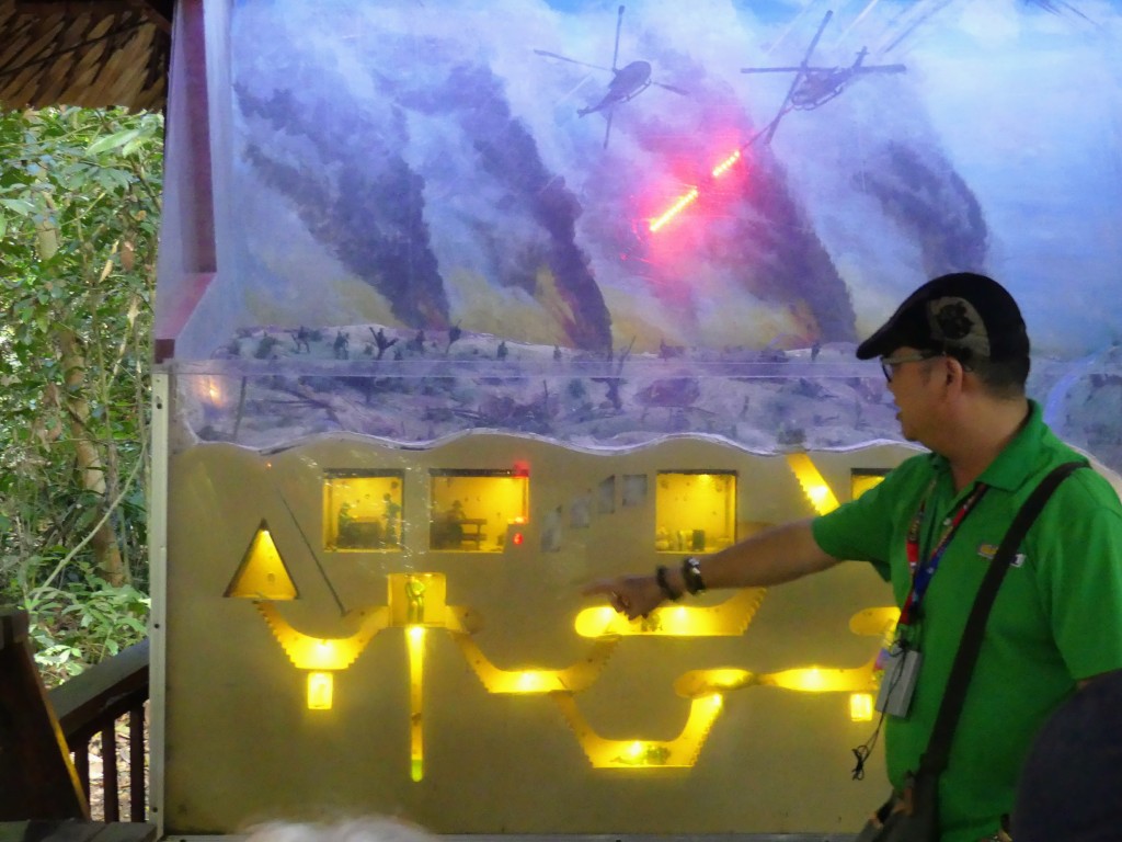 Yang gave us some additional information about the tunnels. He showed us a 3-D model of the tunnels and pointed out that there were some sections where the tunnels had been narrowed to prevent tunnel rats from being able to get through. The narrow sections were large enough for a small Vietnamese person to traverse, but too small for an American GI. The map shows how extensive the network was as well as color coding that showed which areas were “liberated” (red), which were half-liberted (pink; safe to be out only at night), and blue (below American controlled areas). During the night, VC soldiers would raid the American camps to steal shampoo. Why shampoo? So that when they washed their hair, they smelled like American soldiers and could not be distinguished as Vietnamese when they were out at night.
