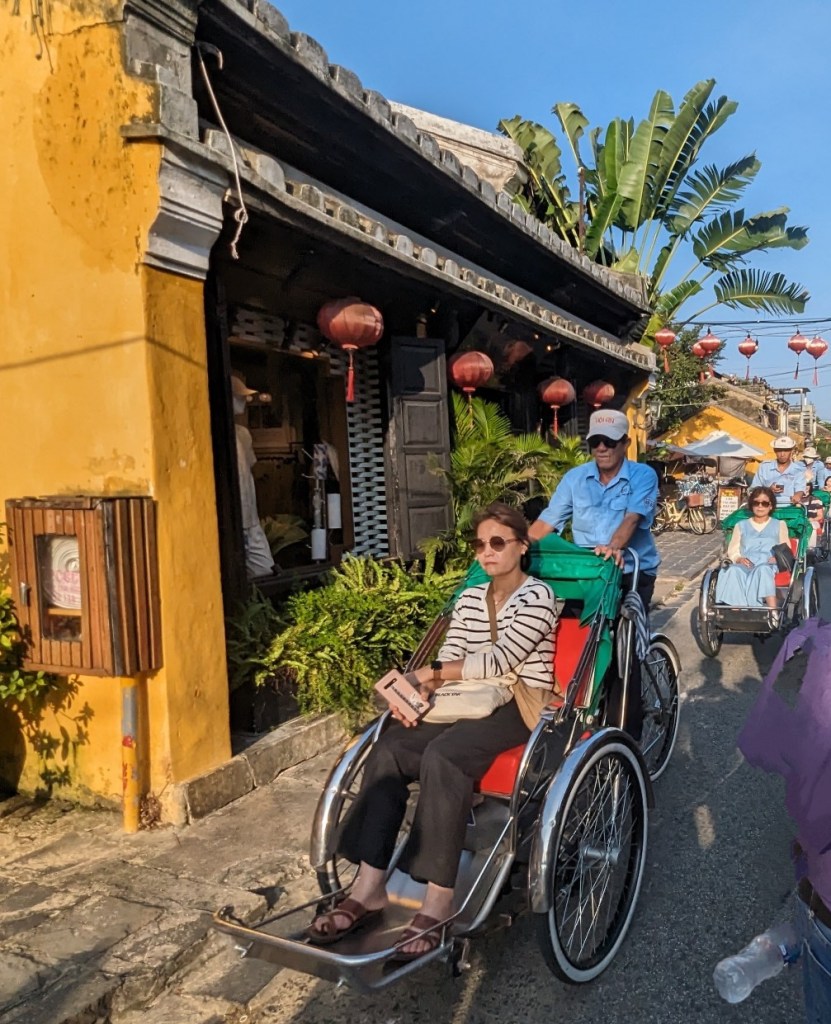 After breakfast, we headed back to the ancient city to wander around before the hordes of tourists arrived. Most of the shops had not opened yet, which was fine because no one was pestering us to buy anything. We don’t buy souvenirs anymore so didn’t miss out on any shopping opportunities. We found a café by the river and ordered coffee. I learned my lesson and ordered a coconut coffee. They may call it coffee, but it’s more like a milkshake with a bit of coffee flavor. Mmmmmmmmm! I highly recommend it! Clayton ordered an Americano. Instead, he was brought an iced coffee. He is not a fan. Next time, he will order a Saigon coffee, which is essentially a brewed coffee, like French Press.