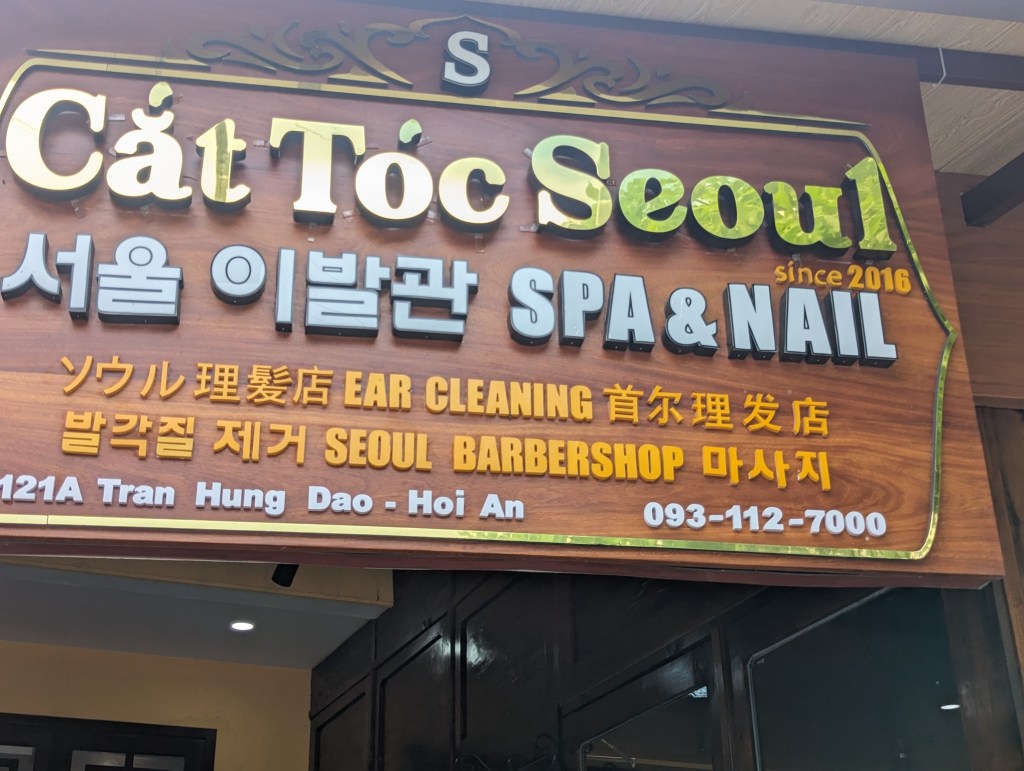 By nine, it was time for a massage! Massage places are a dime a dozen in Hoi An. There was one located right by our hotel that had nearly 2500 ratings on Google, with an average of 4.9 stars (Aaron Spa). We decided to try them. We opted for the one-hour foot massage, which includes a neck/back/shoulder massage as well. While they set up the massage tables, we were given hot tea and coconut crackers. We both had excellent massages and were happy with our choice. After lunch, we wandered around again. I love the most excellent suits they have on display! They can create a custom-tailored suit in 24 hours. A few other oddities caught my eye as well.