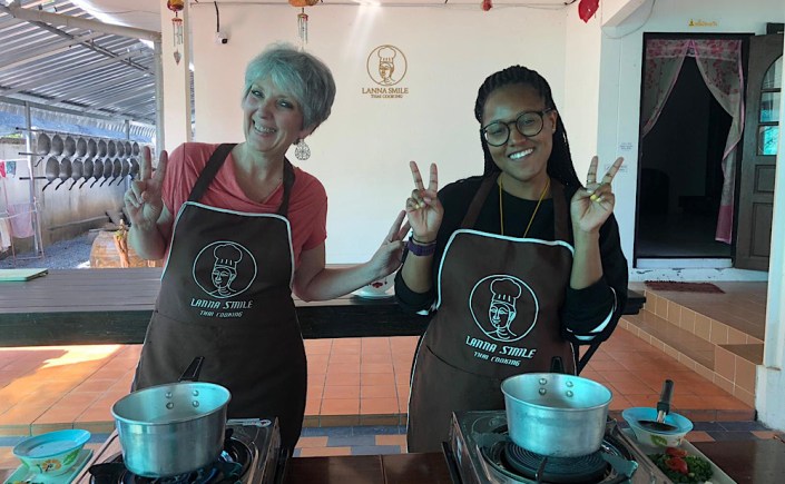 I was able to reserve my spot online https://lannasmilethaicooking.com. All of the schools will pick you up at your hotel (or other accommodation) and take you to visit a market to show you the different foods you will be cooking with. I was picked up by Nim and Pim, the owners of the school. It turns out that there would be only one other student on the day I visited; a lovely young lady named Daneesha. She was on a break from teaching in South Korea and was traveling solo around SE Asia. Chiang Mai was her first stop. We really hit it off, which made the time in class fly by. I made pad Thai, Kao Soi, Tom Kha Gai, spring rolls, and mango sticky rice. Let’s just say that all were delicious!