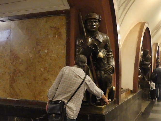 We used the Metro to get into town. The Metro stations in Moscow are quite beautiful. This particular one had brass statues lining the entryways. People would rub the brass for luck as they passed by. The dog’s nose was quite popular!