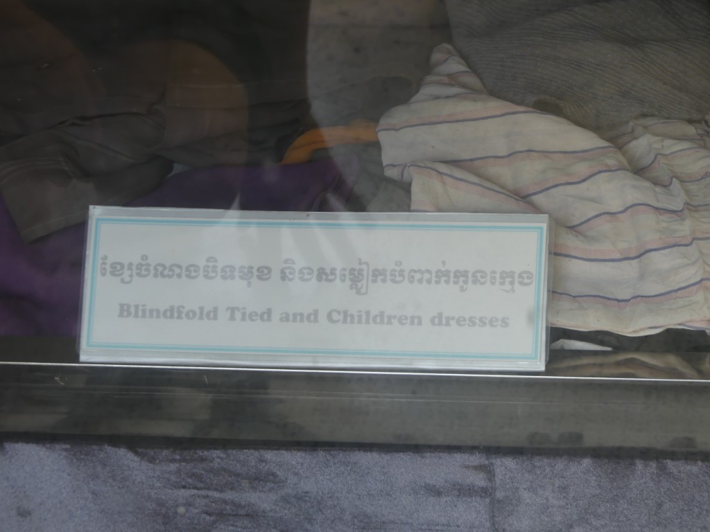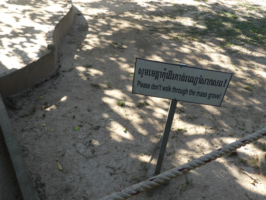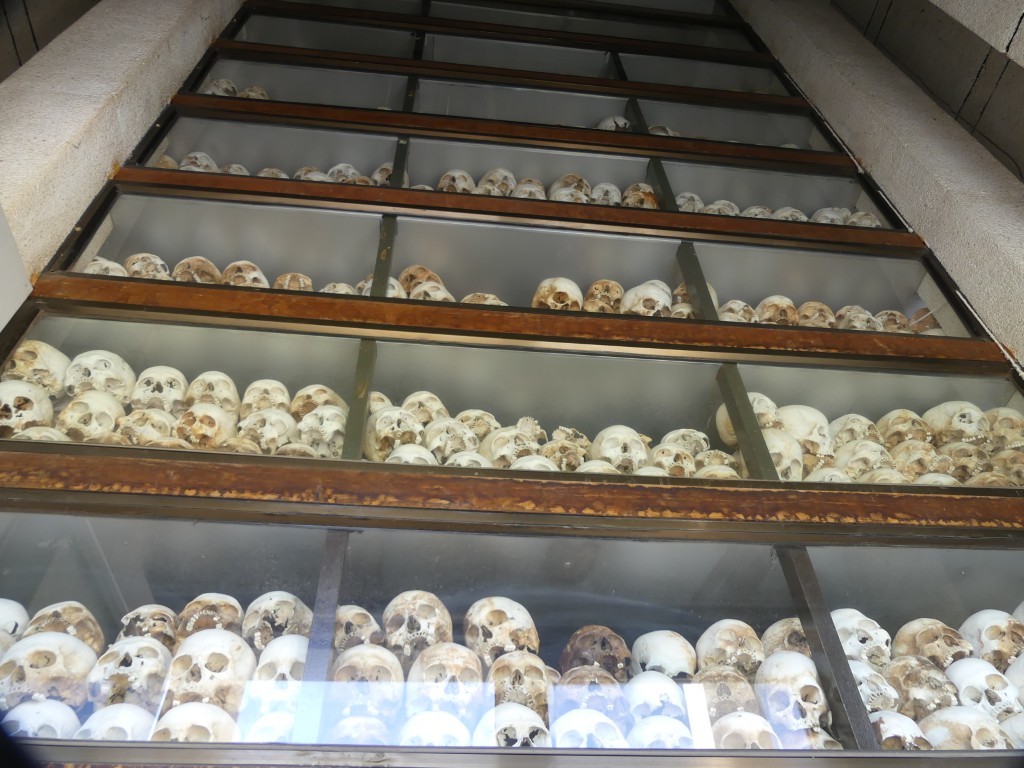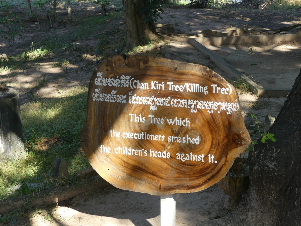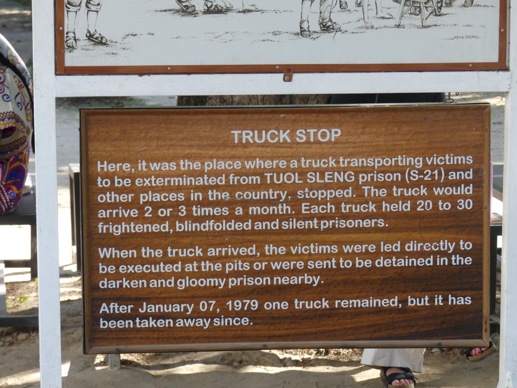After a fabulous lunch served at a local restaurant, we headed to the Killing Fields. This is but one of over two hundred killing fields, the largest of which is in the Battambang province. This one is located on a former Chinese graveyard and longan farm. Upon entry, our tour guide told us a brief history of the Pol Pot regime. It was originally thought that Pol Pot would bring peace to Cambodia. That lasted all of one day. By the time he went into hiding in the jungle, he had killed about half the population of Cambodia. He targeted the educated, governmental officials, and monks. If you wore glasses, you were executed. If you were bald, you were executed. Police and soldiers were his biggest enemies. A cop and a teacher from each village were tortured to point out others that were “enemies of the state”. Groups of up to fifty were then taken by truck to the killing fields, often forced to dig their own graves before being murdered. Bayonets were used to ensure that they were dead before removing their blindfolds and ropes to be reused on the next set of victims.